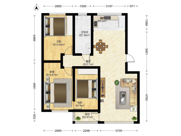 房屋戶型: 3 室1廳 1 廚1衛(wèi)