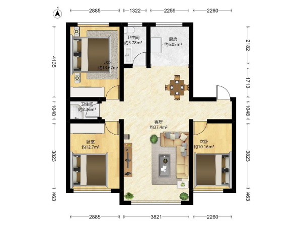 房屋戶型: 3 室2廳 1 廚2衛(wèi)