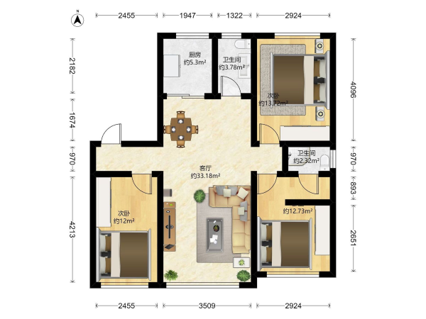 房屋戶型: 3 室2廳 1 廚2衛(wèi)